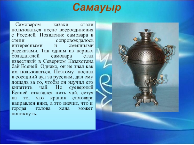 степи сопровождалось интересными и смешными рассказами. Так одним из первых обладателей самовара стал известный в Северном Казахстана бай Есеней. Однако, он не знал как им пользоваться. Поэтому послал в соседний аул за русским, дал ему лошадь за то, чтобы он научил его кипятить чай. Но суеверный Есеней отказался пить чай, сетуя на то, что краник самовара направлен вниз, а это значит, что и гордая голова хана может поникнуть.