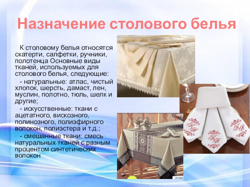 К столовому белья относятся скатерти, салфетки, ручники, полотенца Основные