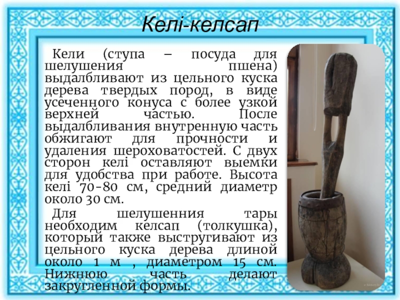 Для шелушенния тары необходим келсап (толкушка), который также выстругивают из цельного куска дерева длиной около 1 м , диаметром 15 см. Нижнюю часть делают закругленной формы.