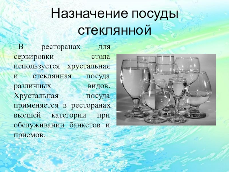 посуда различных видов. Хрустальная посуда применяется в ресторанах высшей категории при обслуживании банкетов и приемов.