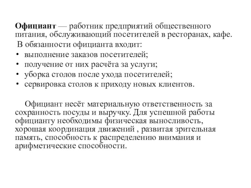 Слайд 6Официант — работник предприятий общественного питания, обслуживающий посетителей в ресторанах, кафе.