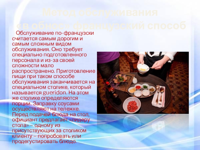 и самым сложным видом обслуживания. Оно требует специально подготовленного персонала и из-за своей сложности мало распространено. Приготовление пищи при таком способе обслуживания заканчивается на специальном столике, который называется gueridon. На этом же столике определяются порции. Заправку соусами осуществляют на тележке. Перед подачей блюда на стол, официант предлагает «лидеру стола» – одному из присутствующих за столиком клиенту – попробовать или продегустировать блюдо.