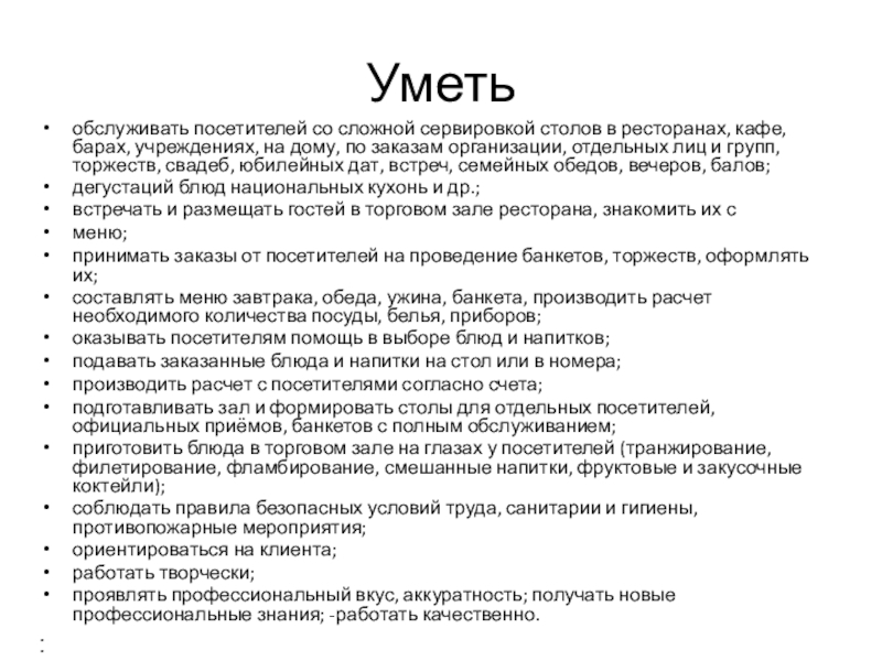 приготовить блюда в торговом зале на глазах у посетителей (транжирование, филетирование, фламбирование, смешанные напитки, фруктовые и закусочные коктейли);