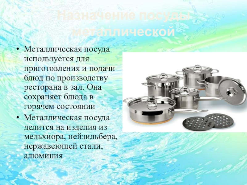 Металлическая посуда делится на изделия из мельхиора, нейзильбера, нержавеющей стали, алюминия
