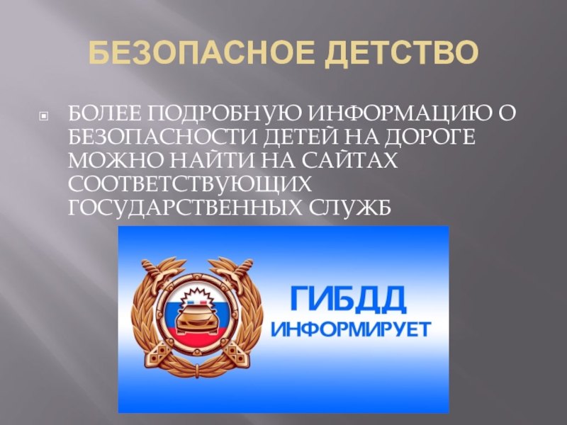 БЕЗОПАСНОЕ ДЕТСТВОБОЛЕЕ ПОДРОБНУЮ ИНФОРМАЦИЮ О БЕЗОПАСНОСТИ ДЕТЕЙ НА ДОРОГЕ МОЖНО НАЙТИ НА САЙТАХ СООТВЕТСТВУЮЩИХ ГОСУДАРСТВЕННЫХ СЛУЖБ