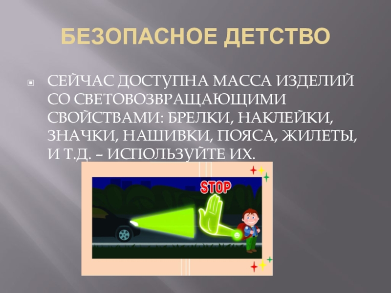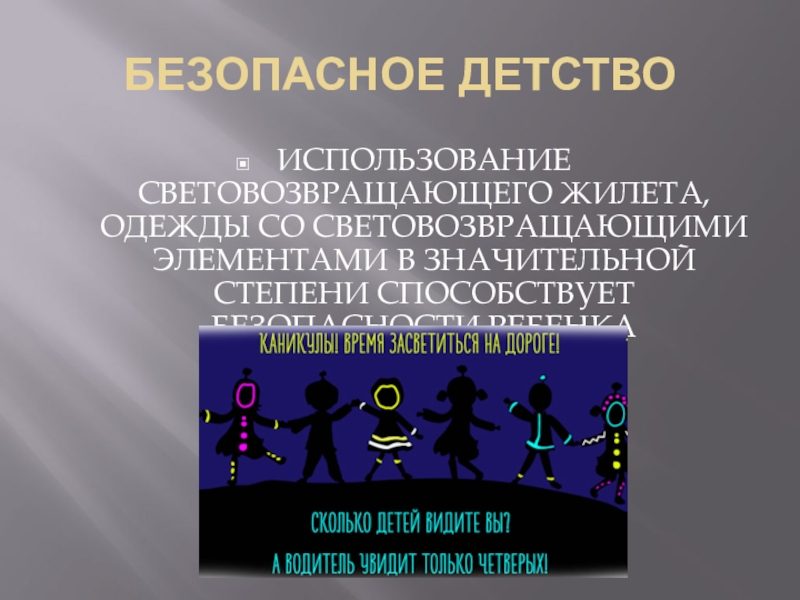 БЕЗОПАСНОЕ ДЕТСТВОИСПОЛЬЗОВАНИЕ СВЕТОВОЗВРАЩАЮЩЕГО ЖИЛЕТА, ОДЕЖДЫ СО СВЕТОВОЗВРАЩАЮЩИМИ ЭЛЕМЕНТАМИ В ЗНАЧИТЕЛЬНОЙ СТЕПЕНИ СПОСОБСТВУЕТ БЕЗОПАСНОСТИ РЕБЕНКА