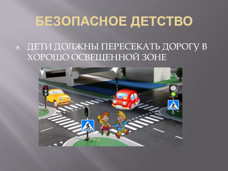 БЕЗОПАСНОЕ ДЕТСТВОДЕТИ ДОЛЖНЫ ПЕРЕСЕКАТЬ ДОРОГУ В ХОРОШО ОСВЕЩЕННОЙ ЗОНЕ