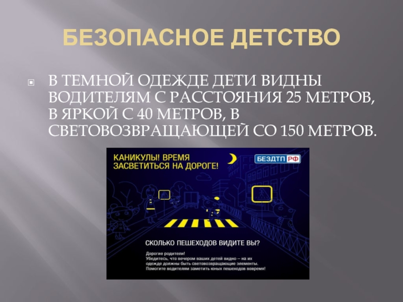 БЕЗОПАСНОЕ ДЕТСТВОВ ТЕМНОЙ ОДЕЖДЕ ДЕТИ ВИДНЫ ВОДИТЕЛЯМ С РАССТОЯНИЯ 25 МЕТРОВ, В ЯРКОЙ С 40 МЕТРОВ, В