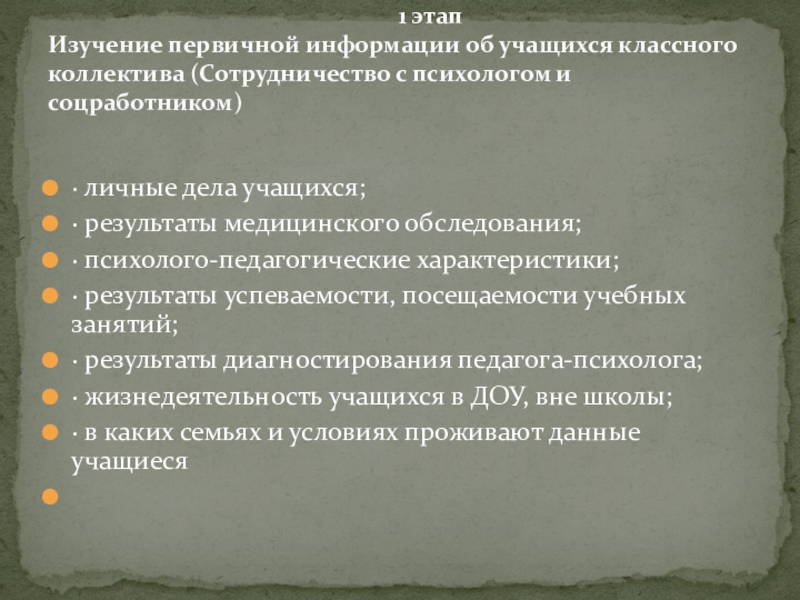 Изучение первичной информации об учащихся классного коллектива (Сотрудничество с психологом и соцработником)