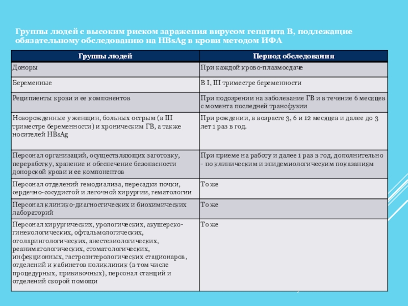 Слайд 13Группы людей с высоким риском заражения вирусом гепатита В, подлежащие обязательному