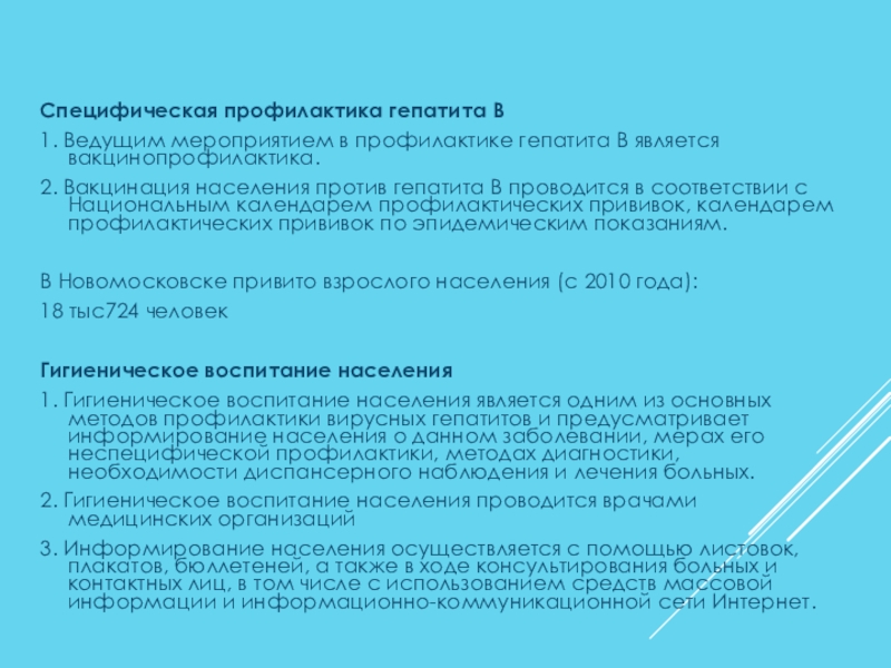 1. Гигиеническое воспитание населения является одним из основных методов профилактики вирусных гепатитов и предусматривает информирование населения о данном заболевании, мерах его неспецифической профилактики, методах диагностики, необходимости диспансерного наблюдения и лечения больных.