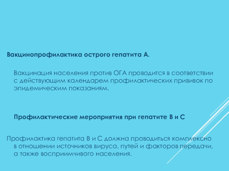 Профилактика гепатита В и С должна проводиться комплексно в отношении источников вируса, путей и факторов передачи, а также восприимчивого населения.