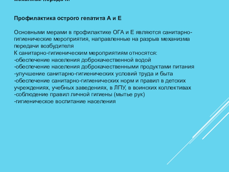 Основными мерами в профилактике ОГА и Е являются санитарно-гигиенические мероприятия, направленные на разрыв механизма передачи возбудителя