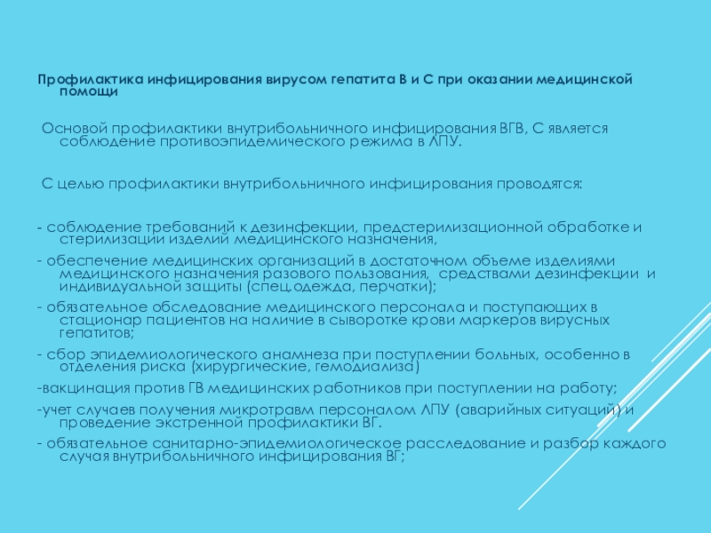 Основой профилактики внутрибольничного инфицирования ВГВ, С является соблюдение противоэпидемического режима в ЛПУ.
