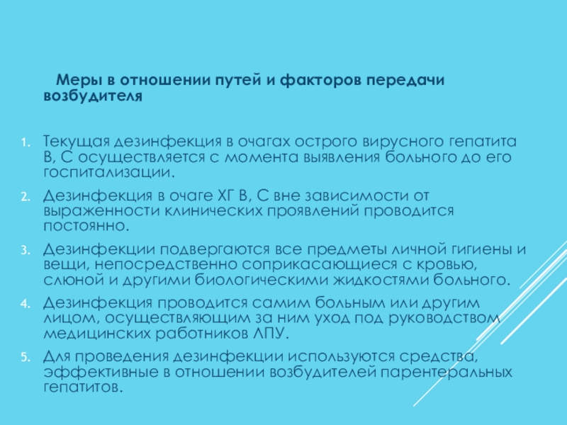 Текущая дезинфекция в очагах острого вирусного гепатита В, С осуществляется с момента выявления больного до его госпитализации.