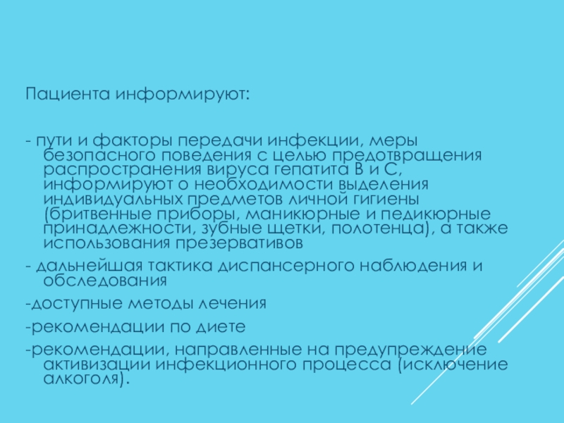 -рекомендации, направленные на предупреждение активизации инфекционного процесса (исключение алкоголя).