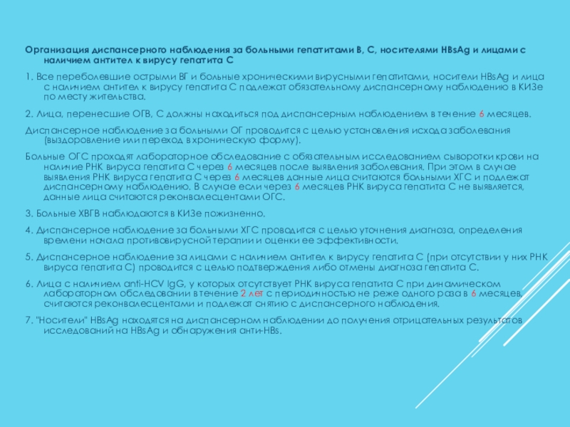 1. Все переболевшие острыми ВГ и больные хроническими вирусными гепатитами, носители HBsAg и лица с наличием антител к вирусу гепатита С подлежат обязательному диспансерному наблюдению в КИЗе по месту жительства.