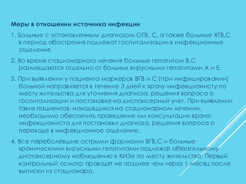 4. Все переболевшие острыми формами ВГВ,С и больные хроническими вирусными гепатитами подлежат обязательному диспансерному наблюдению в КИЗе по месту жительства. Первый контрольный осмотр проводят не позднее чем через 1 месяц после выписки из стационара.