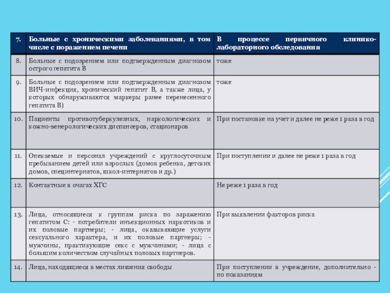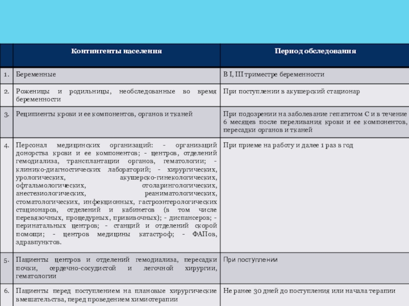 Слайд 14Контингенты, подлежащие обязательному обследованию на наличие anti-HCV IgG в сыворотке (плазме)