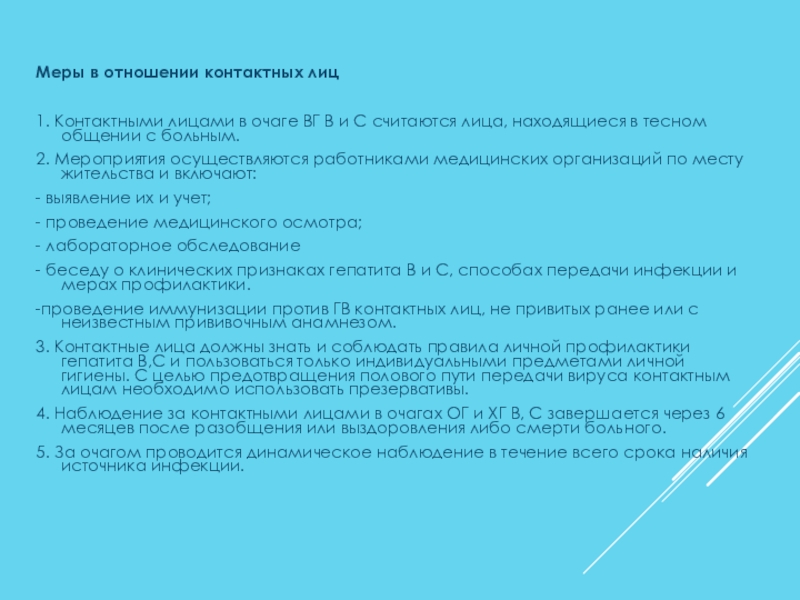 3. Контактные лица должны знать и соблюдать правила личной профилактики гепатита В,С и пользоваться только индивидуальными предметами личной гигиены. С целью предотвращения полового пути передачи вируса контактным лицам необходимо использовать презервативы.