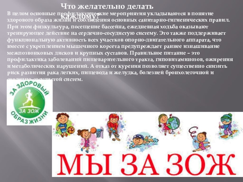 здорового образа жизни и соблюдения основных санитарно-гигиенических правил. При этом физкультура, посещение бассейна, ежедневная ходьба оказывают тренирующее действие на сердечно-сосудистую систему. Это также поддерживает функциональную активность всех участков опорно-двигательного аппарата, что вместе с укреплением мышечного корсета предупреждает раннее изнашивание межпозвонковых дисков и крупных суставов. Правильное питание – это профилактика заболеваний пищеварительного тракта, гиповитаминозов, ожирения и метаболических нарушений. А отказ от курения позволяет существенно снизить риск развития рака легких, пищевода и желудка, болезней бронхолегочной и сердечно-сосудистой систем.