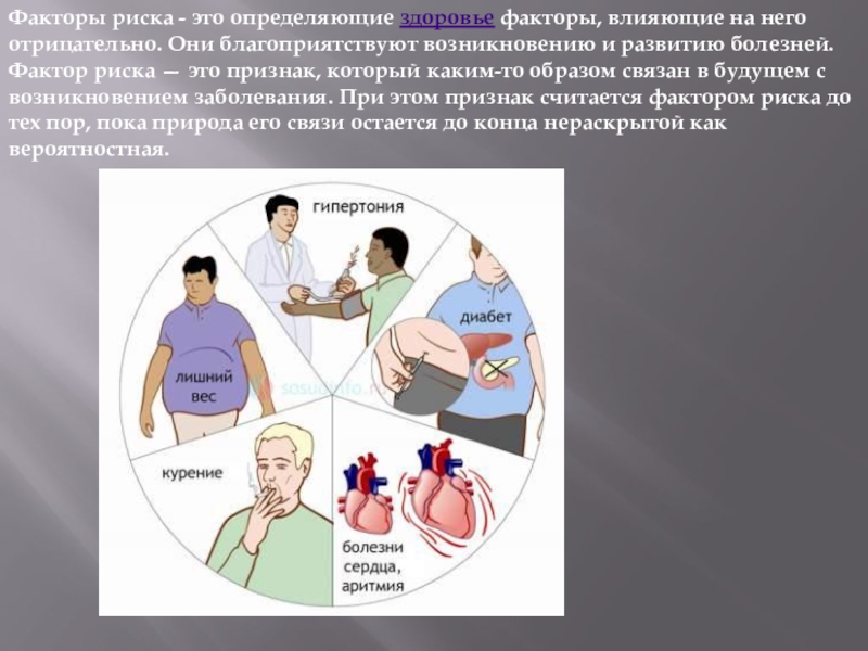 Слайд 14Факторы риска - это определяющие здоровье факторы, влияющие на него отрицательно. Они благоприятствуют возникновению