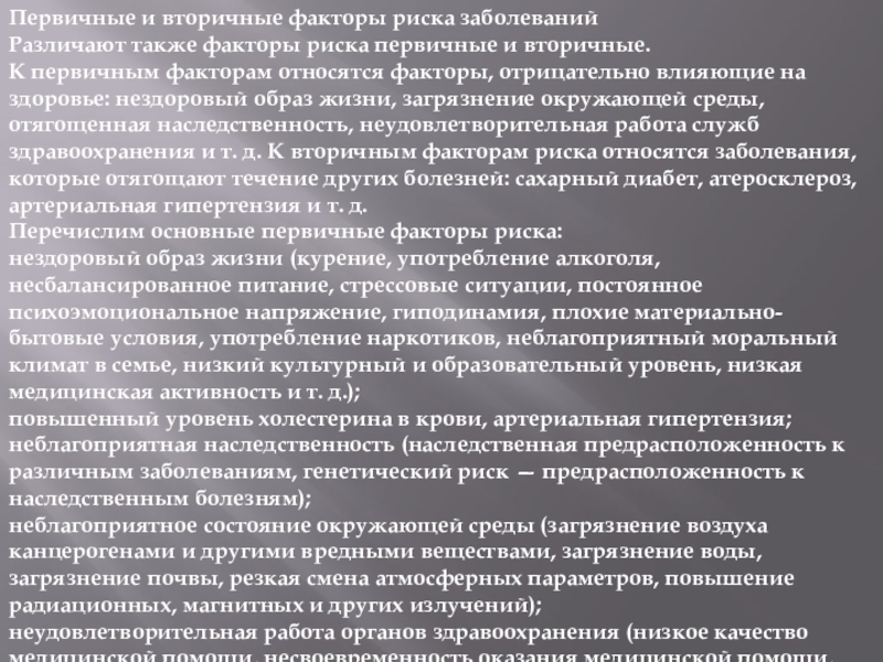 вторичные. К первичным факторам относятся факторы, отрицательно влияющие на здоровье: нездоровый образ жизни, загрязнение окружающей среды, отягощенная наследственность, неудовлетворительная работа служб здравоохранения и т. д. К вторичным факторам риска относятся заболевания, которые отягощают течение других болезней: сахарный диабет, атеросклероз, артериальная гипертензия и т. д.