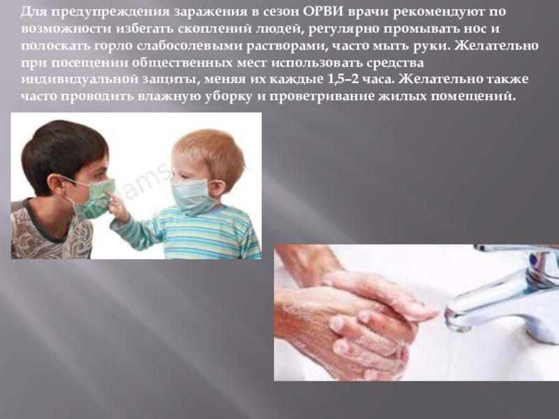 Слайд 11Для предупреждения заражения в сезон ОРВИ врачи рекомендуют по возможности избегать