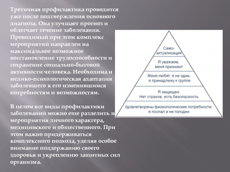 Слайд 7Третичная профилактика проводится уже после подтверждения основного диагноза. Она улучшает прогноз