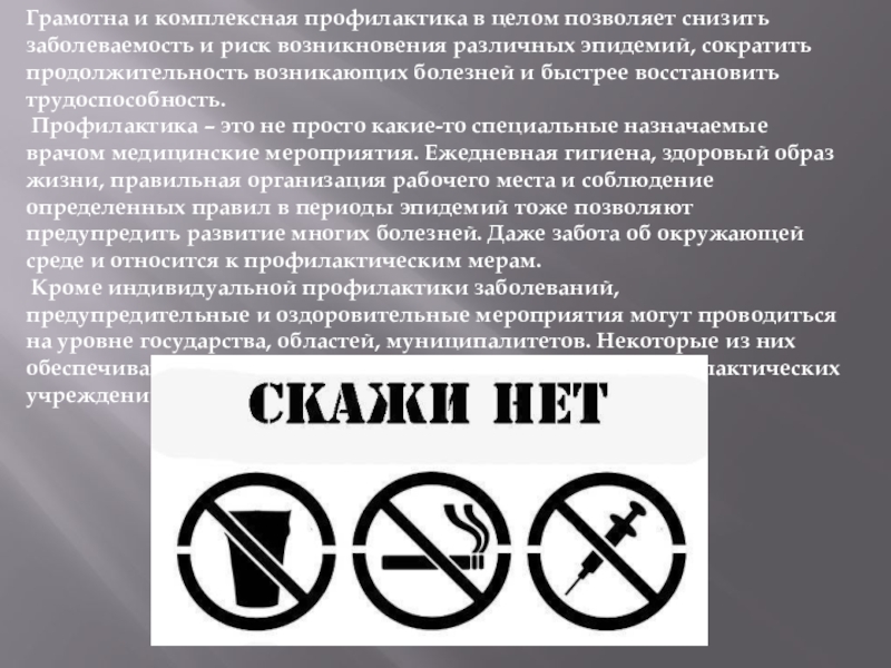 Слайд 4Грамотна и комплексная профилактика в целом позволяет снизить заболеваемость и риск