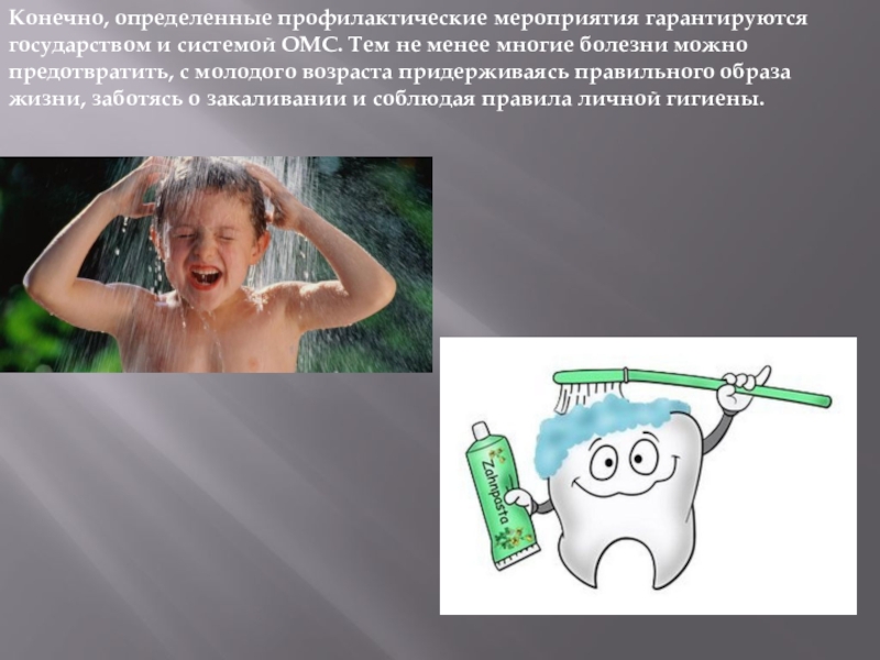 Слайд 13Конечно, определенные профилактические мероприятия гарантируются государством и системой ОМС. Тем не