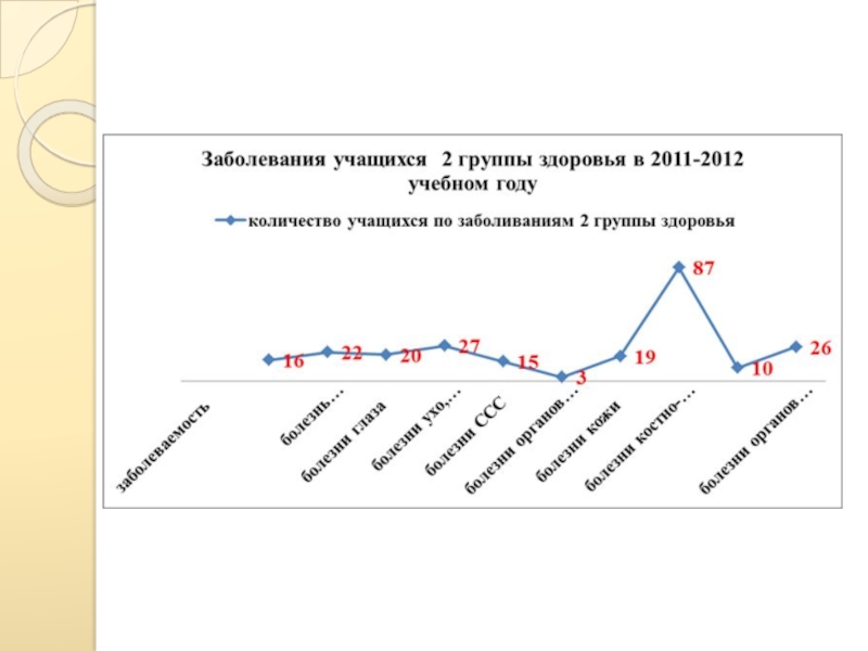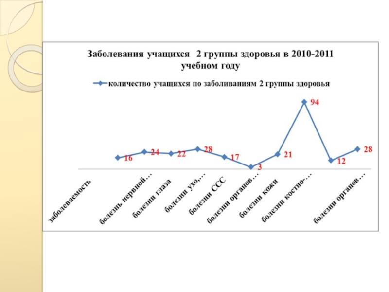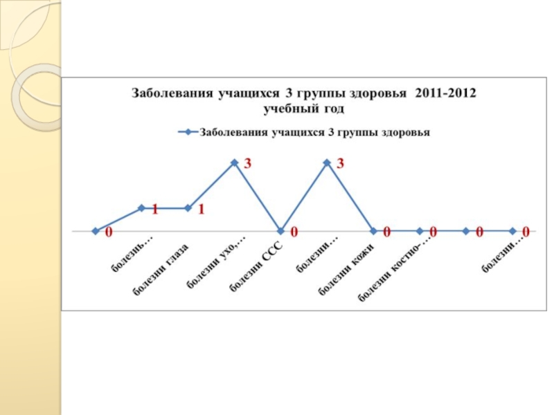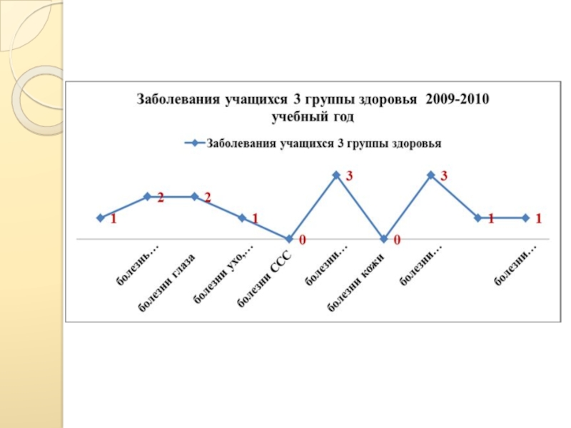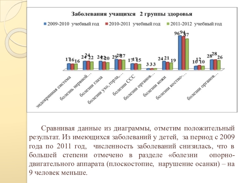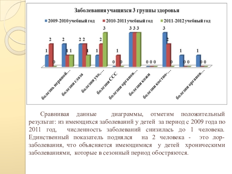 Слайд 21 Сравнивая данные из диаграммы, отметим положительный результат. Из имеющихся заболеваний у