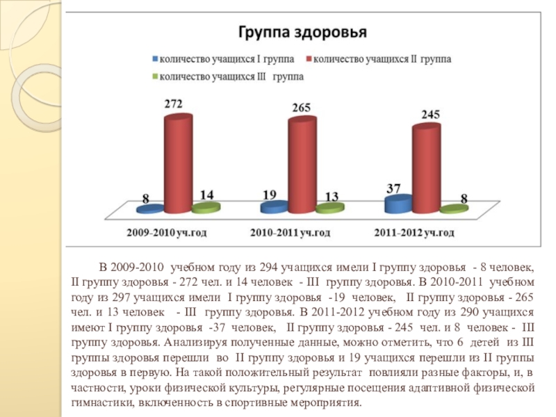 - 8 человек, II группу здоровья - 272 чел. и 14 человек - III группу здоровья. В 2010-2011 учебном году из 297 учащихся имели I группу здоровья -19 человек, II группу здоровья - 265 чел. и 13 человек - III группу здоровья. В 2011-2012 учебном году из 290 учащихся имеют I группу здоровья -37 человек, II группу здоровья - 245 чел. и 8 человек - III группу здоровья. Анализируя полученные данные, можно отметить, что 6 детей из III группы здоровья перешли во II группу здоровья и 19 учащихся перешли из II группы здоровья в первую. На такой положительный результат повлияли разные факторы, и, в частности, уроки физической культуры, регулярные посещения адаптивной физической гимнастики, включенность в спортивные мероприятия.