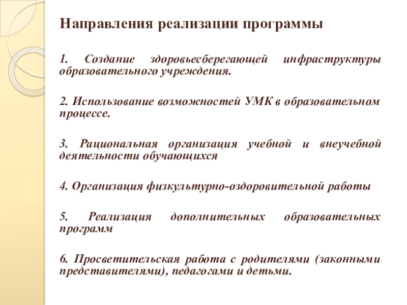 1. Создание здоровьесберегающей инфраструктуры образовательного учреждения.