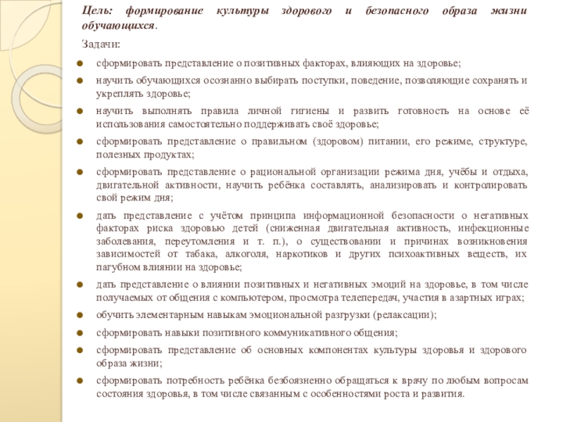 дать представление с учётом принципа информационной безопасности о негативных факторах риска здоровью детей (сниженная двигательная активность, инфекционные заболевания, переутомления и т. п.), о существовании и причинах возникновения зависимостей от табака, алкоголя, наркотиков и других психоактивных веществ, их пагубном влиянии на здоровье;