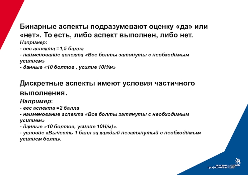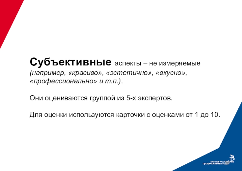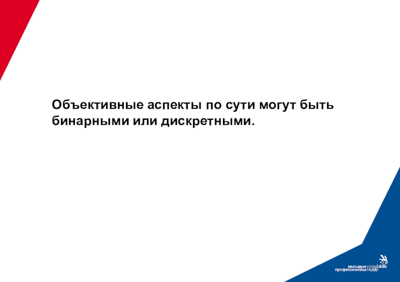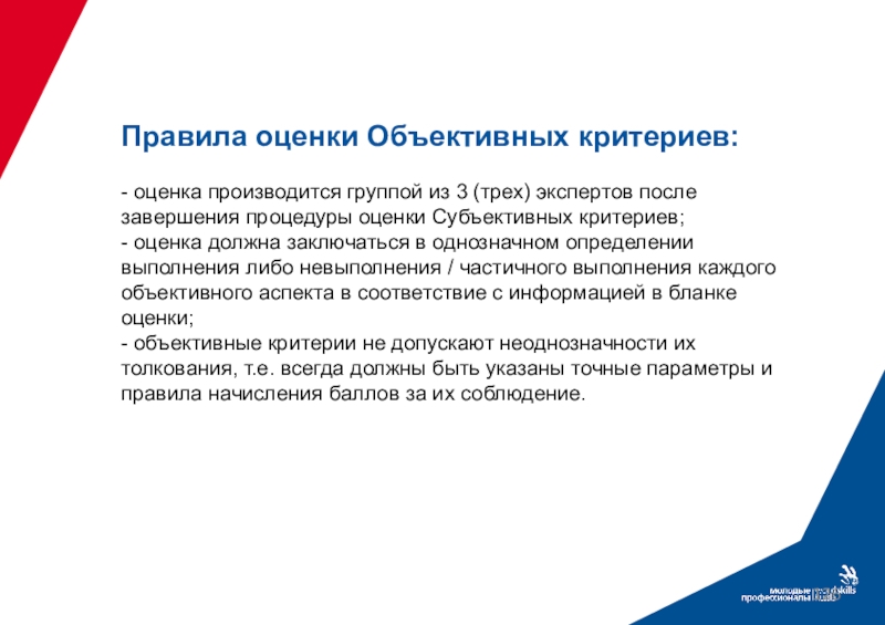 - оценка должна заключаться в однозначном определении выполнения либо невыполнения / частичного выполнения каждого объективного аспекта в соответствие с информацией в бланке оценки;