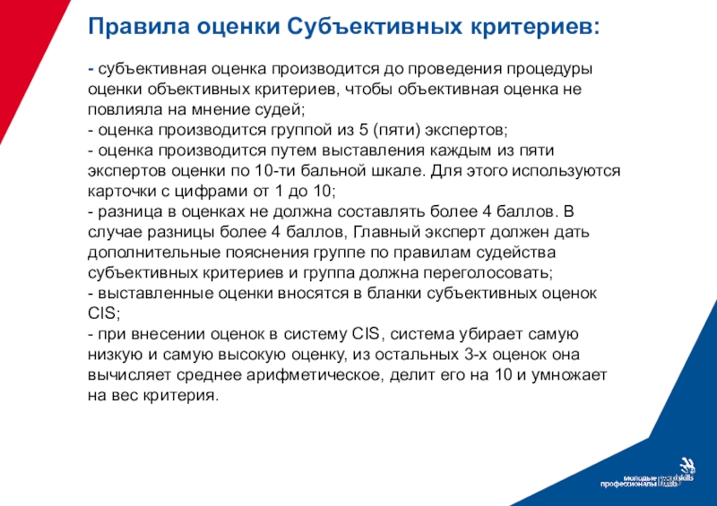 - разница в оценках не должна составлять более 4 баллов. В случае разницы более 4 баллов, Главный эксперт должен дать дополнительные пояснения группе по правилам судейства субъективных критериев и группа должна переголосовать;