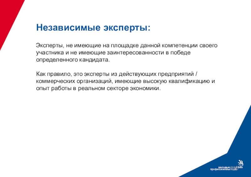 - эксперты, прошедшие обучение, организованное Союзом «Ворлдскиллс Россия» и имеющие свидетельства о праве проведения корпоративного или регионального чемпионата