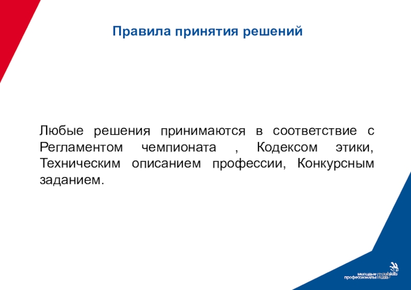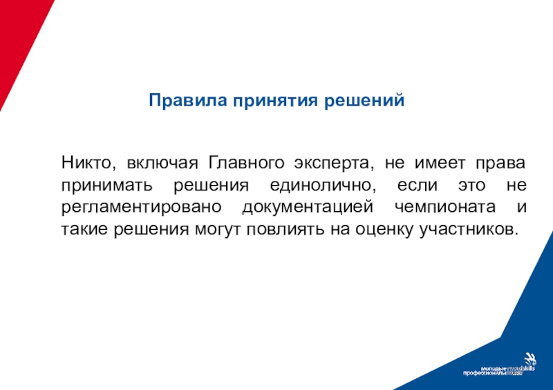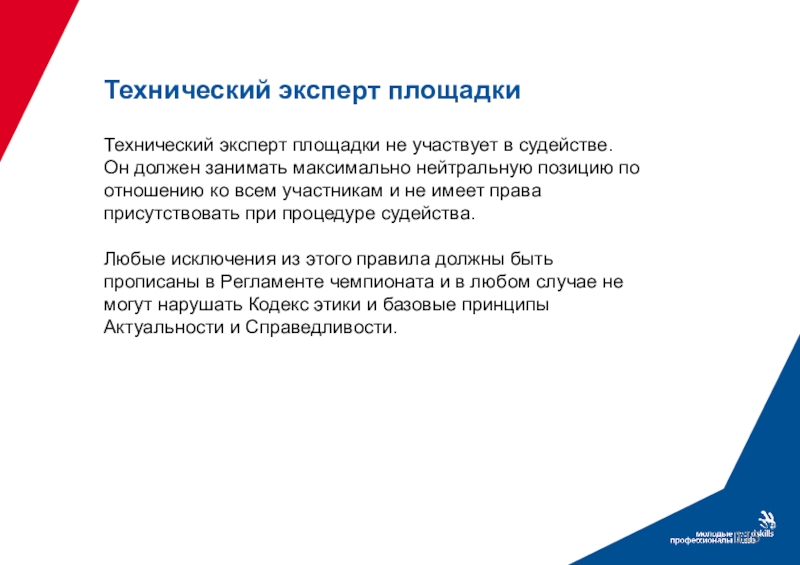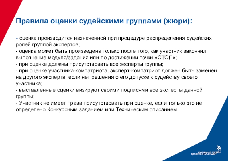 - Участник не имеет права присутствовать при оценке, если только это не определено Конкурсным заданием или Техническим описанием.
