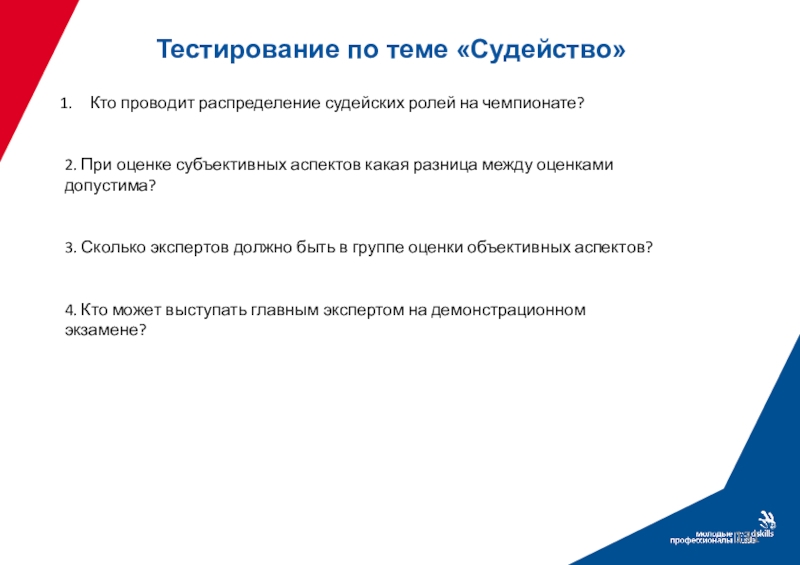 - Судейское жюри для оценки Объективных (3 эксперта) и Судейских (3 эксперта) / Субъективных (5 экспертов) критериев (на ДЭ для выполнения этой функции назначаются эксперты, прошедшие обучение по программе для экспертов ДЭ).