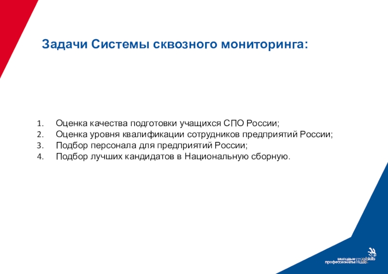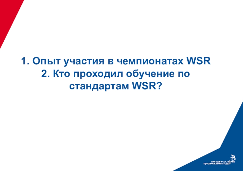 - Руководством страны поставлена задача по внедрению стандартов WSR при проведении сквозной оценки уровня подготовки учащихся системы профессионального образования и специалистов промышленных компаний с госучастием.