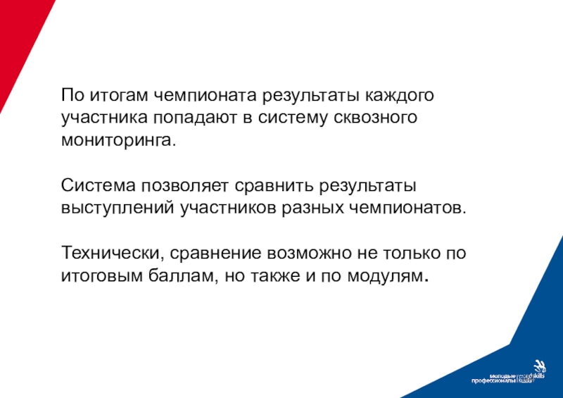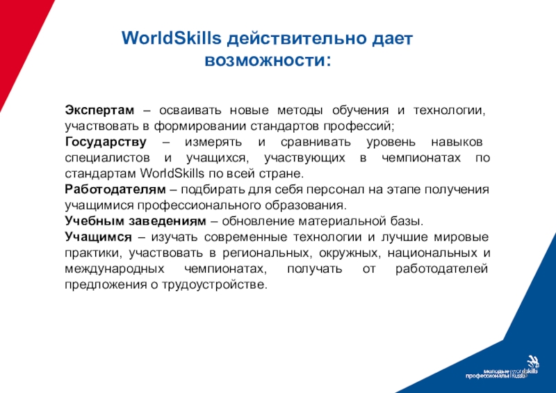 Государству – измерять и сравнивать уровень навыков специалистов и учащихся, участвующих в чемпионатах по стандартам WorldSkills по всей стране.