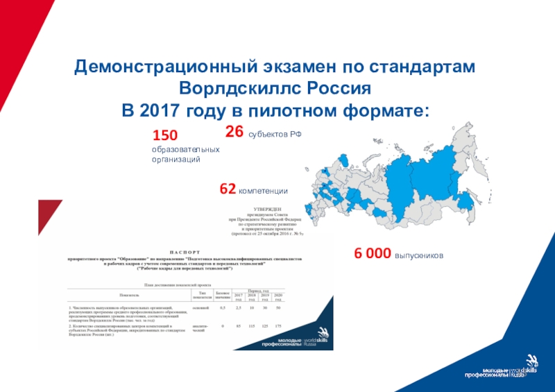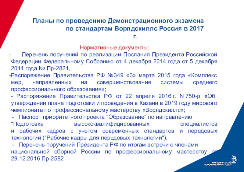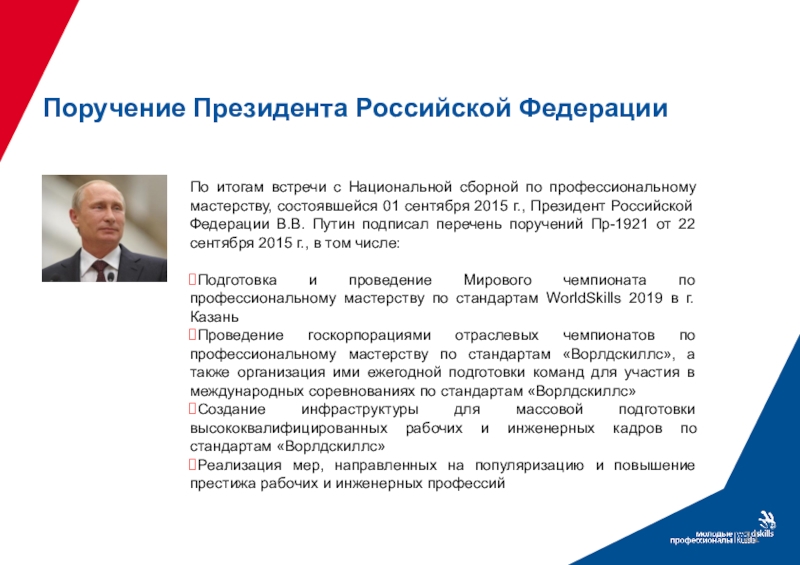 мастерству, состоявшейся 01 сентября 2015 г., Президент Российской Федерации В.В. Путин подписал перечень поручений Пр-1921 от 22 сентября 2015 г., в том числе: