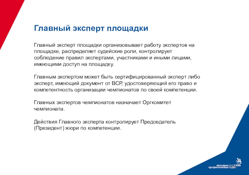 Главным экспертом может быть сертифицированный эксперт либо эксперт, имеющий документ от ВСР, удостоверяющий его право и компетентность организации чемпионатов по своей компетенции.