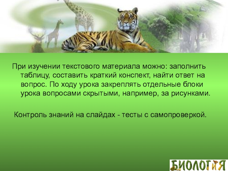 Контроль знаний на слайдах - тесты с самопроверкой.