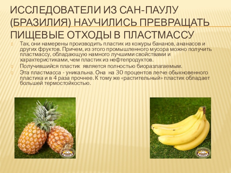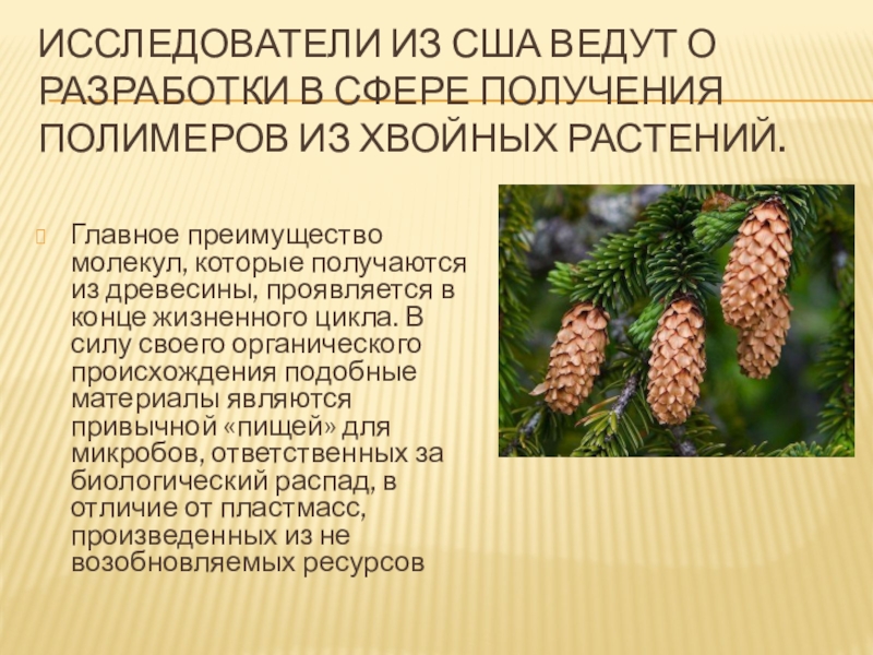 Главное преимущество молекул, которые получаются из древесины, проявляется в конце жизненного цикла. В силу своего органического происхождения подобные материалы являются привычной «пищей» для микробов, ответственных за биологический распад, в отличие от пластмасс, произведенных из не возобновляемых ресурсов