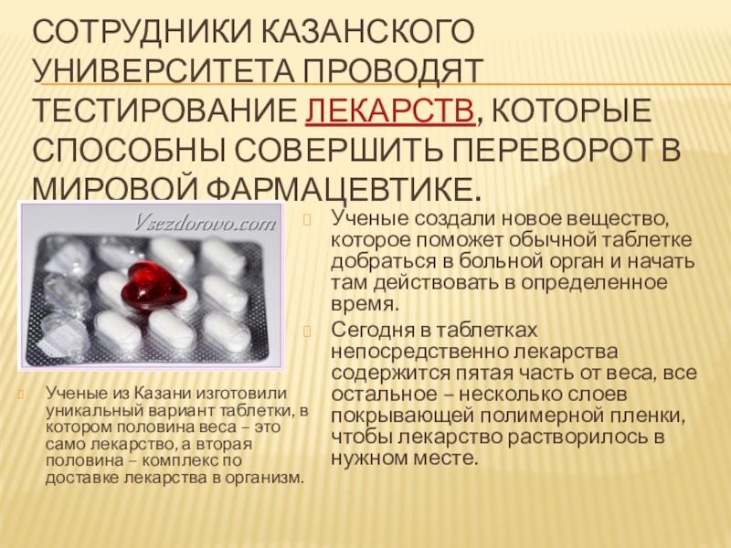 Ученые из Казани изготовили уникальный вариант таблетки, в котором половина веса – это само лекарство, а вторая половина – комплекс по доставке лекарства в организм.