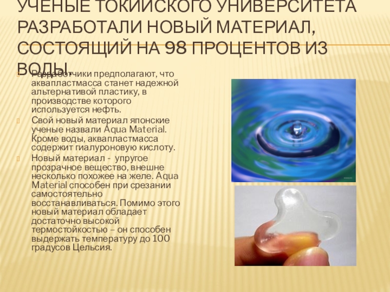 Свой новый материал японские ученые назвали Aqua Material. Кроме воды, аквапластмасса содержит гиалуроновую кислоту.
