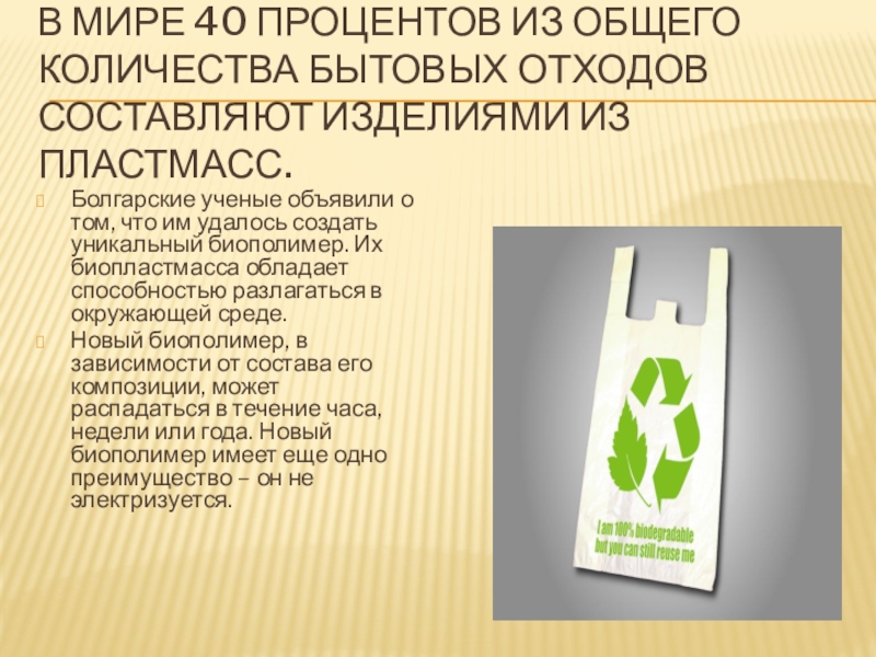 Болгарские ученые объявили о том, что им удалось создать уникальный биополимер. Их биопластмасса обладает способностью разлагаться в окружающей среде.