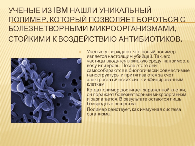 Когда полимер достигает зараженной клетки, он поражает болезнетворный микроорганизм и разлагается. В результате остаются лишь безвредные вещества.
